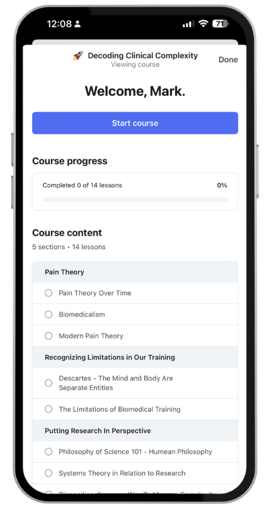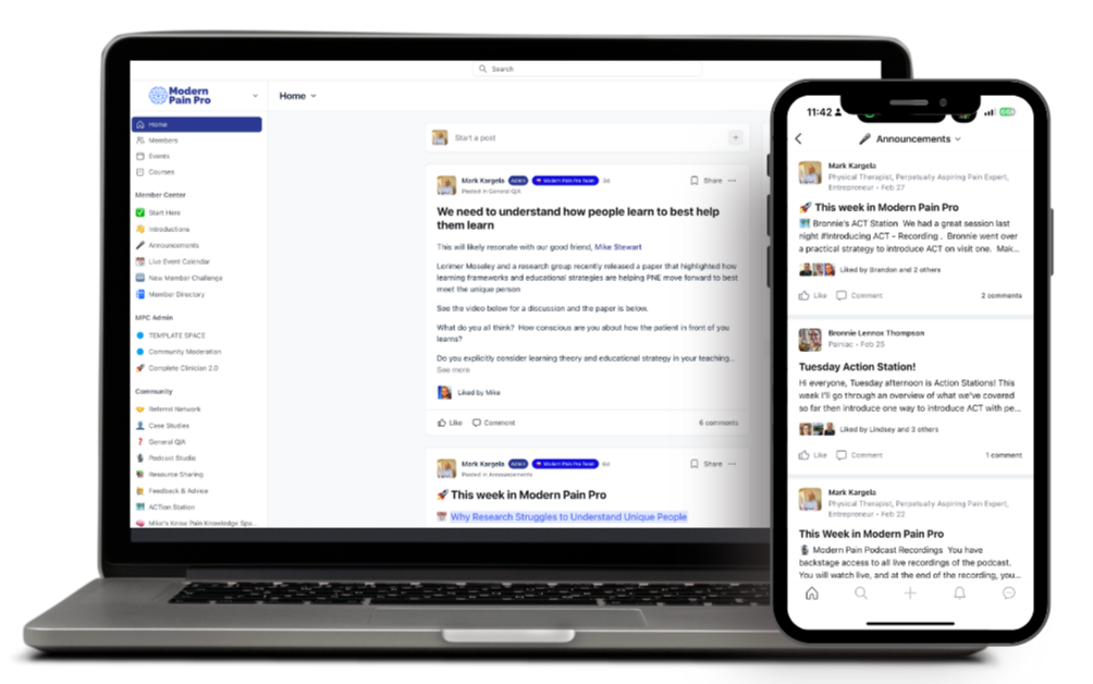 Despite courses claiming there is one solution or approach you've probably noticed that 10-20% of people do not respond to whatever approach or intervention you use. Your job is complex. Pain is complex. Don't go it alone!Too many clinicians feel alone. You often feel like you are on an island trying to practice in modern frameworks while your colleagues remain stuck in dated approaches and models.At Modern Pain Pro we provide an environment of support and growth for you to learn how to succeed and thrive in the complexity you face each day in clinic.